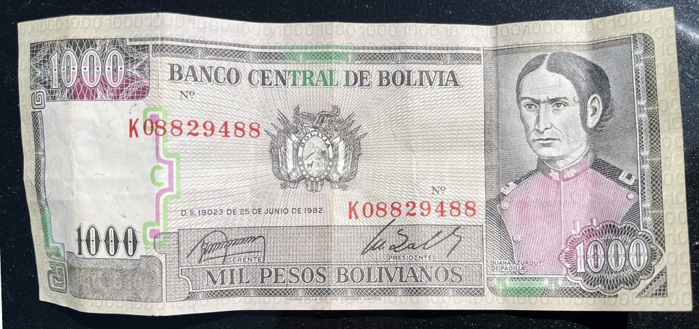 I’ve been a little short lately. Just found this random Bolivian peso note my brother handed me after coming home from his job as a chef on the cruise line. I googled it. The Bolivian boliviano is called the BOB. The figure pictured here is Juana Azurduy de Padilla (1780-1862), highly regarded in Bolivia and Argentina as a guerrilla independence hero. As a result of her rambunctious girlhood, she was sent to a Peruvian nunnery, where she styled herself after Joan of Arc. After the nuns had enough of this and tossed her out, she got involved with indigenous revolts against the Spanish silver mines. She could shoot and ride. Along with her husband, she joined the revolution as a military leader and fought for years against the colonial occupation. She was a gifted recruiter, even assembling a battle-hardened force of female fighters she called her Amazonas. Generals gave her their swords in tribute. Meanwhile, she bore five children. After her husband was captured and beheaded by the Spanish royalists, she rose to the rank of commander, directing a force of 6,000 men. Simon Bolivar remarked that the country should be named after her instead. Turns out, one mil pesos bolivianos is worth around $145 U.S. dollars. That would help my bottom line these days, but no one would exchange the bill. My bank said, “We don’t do business with Bolivia.”